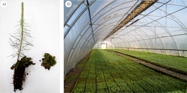 При создании искусственных лесов уделяется большое внимание качеству посадочного материала, от которого в значительной степени зависит успех лесовыращивания. В настоящее время наиболее перспективным в качестве посадочного материала является использование сеянцев с закрытой корневой системой (брикетированные / контейнеризированные), которые считаются наиболее перспективными и надёжными. Такие сеянцы (рис. 1а) выращиваются, как правило, в условиях теплиц, где регулируются температурные и влажностные условия (рис. 1б). Сеянцы выращиваются в специальных кассетах, наполненных субстратом. В качестве субстрата используется верховой торф, который отличается высокой влагоудерживающей способностью, не слеживается, обладает антисептическими свойствами [Жигунов].