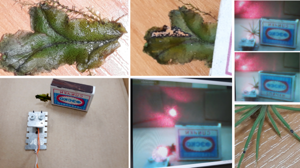 На первом этапе работы были проведены опыты по воздействию лазерного луча на маршанцию изменчивую и сеянцы хвойных пород. В качестве донора лазерного диода использовался списанный DVD±R/RW привод Nec марки ND-3540A. Лазерный диод был прикручен к основанию из радиатора, а в качестве фокусирующего элемента была также использована линза из привода. Так как работа с лазерами сопряжена с крайней опасностью для зрения, то все работы проводились с особой осторожностью. Для контроля работы лазера было принято решение использовать web-камеру, что позволило наблюдать воздействие лазерного луча по монитору компьютера и исключило вероятность попадания лазерного луча в глаза.