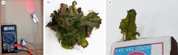 Источником питания напряжением 3.3 В выступал блок питания компьютера. Тестовое подключение лазера показало, что ток потребления составляет 0.22 А (рис. 2а). В качестве тестовых образцов использовалась как маршанция (рис. 2б и 2в), так и сеянцы хвойных растений.