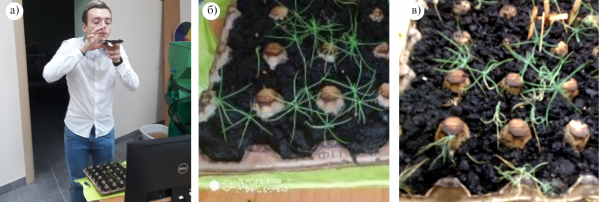 а – процесс фотографирования; б – сеянцы зимой 2024 г.; в – сеянцы весной 2025 г.