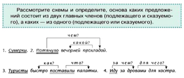 На рисунке 7 представлена проблемная ситуация, соответствующая теме «Предложение и его признаки». Необходимо рассмотреть схемы и определить, основа каких предложений состоит из двух главных членов (подлежащего и сказуемого), а каких – из одного (подлежащего или сказуемого). Эта проблемная ситуация позволит учителю подвести учащихся к определению такой характеристики предложения, как одно-/двусоставность, с помощью неё ребята смогут самостоятельно вывести термины, которые запомнятся значительно лучше, чем если бы их дал учитель. Следует отметить, что данная проблемная ситуация расположена в середине параграфа. Это сделано для того, чтобы на протяжении всего урока дети смогли отмечать в конспекте характерные признаки предложения (после даются сведения о видах грамматических основ), актуализировать знания, полученные в начальной школе.
