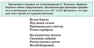 Стихотворение С. Есенина «Береза», представленное на рисунке 2, служит источником для создания проблемной ситуации для темы «Имя прилагательное»; наводящие вопросы позволят вспомнить значение, синтаксическую роль, а также вопросы, на которые отвечает интересующая нас часть речи.  Кроме того, задание в учебнике предлагает доказать учащимся, что текст является художественным, что позволит ученикам развить не только умение отстаивать свою точку зрения, но и способность формулировать связные предложения, выражать свои мысли.