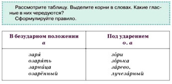 Проблемные ситуации на рисунках 10 и 11 позволят не только подвести к теме урока, но и совершить «научное открытие» – сформулировать правило, которое после следует записать в конспект (можно в том же виде, в котором оно представлено в учебнике). Первая проблемная ситуация предлагается для темы «Буквы а // о в корне -зар- – -зор-», вторая – «Буквы а // о в корне -раст- – -ращ- – -рос-».