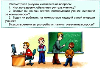 Рисунок 4 можно назвать «репетицией» перед описанием картины, поскольку приведенные в рамочке вопросы требуют развернутого ответа, а также фантазии учащихся. Данная проблемная ситуация соединяет в себе два пункта предложенной нами классификации (иллюстрация + наводящие вопросы). Данное затруднение позволяет ввести в урок развитие речи.