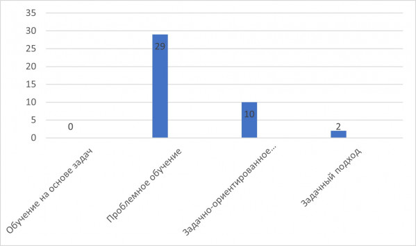 Результаты. На основании анализа данных опроса, направленного на изучение восприятия задачно-ориентированного подхода (Task-Based Learning), были получены следующие результаты: что касается терминологии, наиболее узнаваемым респондентами русскоязычным термином оказалось «проблемное обучение» (33 %), в то время как прямые аналоги, такие как «обучение на основе задач» и «задачный подход», не отмечались участниками как знакомые (рис. 2).